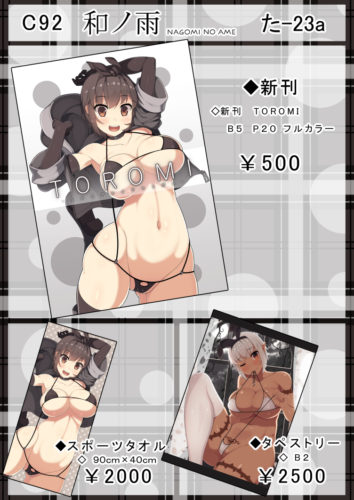 2017/08/04 コメントを残す いよいよ夏コミまであと1週間となりました! お待ちかねのお品書き公開ですぞ! 今回はセットがありません!新刊は1種類です! 他にも既刊1種類持っていきます。 他にはB2タペストリーとスポーツタオルを作りました~。 布ものは数量が少ないので注意ですよ! ※追伸 C92新刊の委託予約始まりました~。8/14から委託開始ですのでこちらもナニトゾ~。 とらのあな様 メロンブックス様 軸中心派様 同人堂様